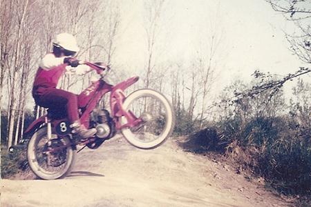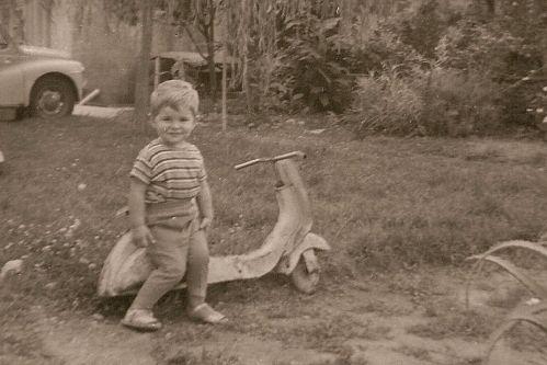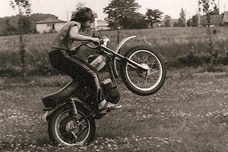 #1-Première moto à moteur. Un Peugeot 104 BB transformé par mon bricoleur de génie de père en mai 68. J'avais 6 ans.